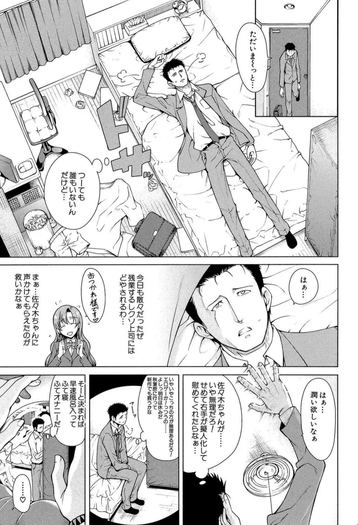 内容:サラリーマンの男は家に帰ってベッドに倒れ込む。日々の疲れが限界だった。ここまでは普通のサラリーマンだったらよくある光景。次の朝、ふと目が覚めるとなんと裸の女の事添い寝していた。びっくりして起きるとその女の子もびっくり。お互いに顔を見合わせているとなんとそこに一人の女神が現れる。この女の子の正体は自分の右手だったのだ。そんな右手とセックス、いやこれはオナニーと一緒。だってその女の子は自分の右手なんだから!